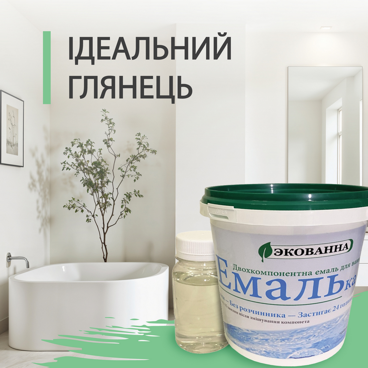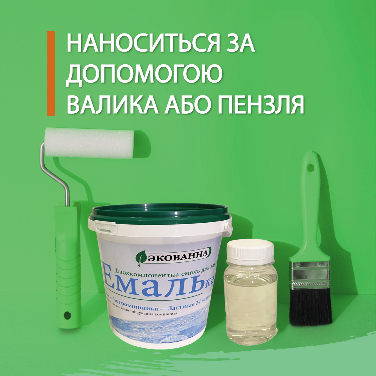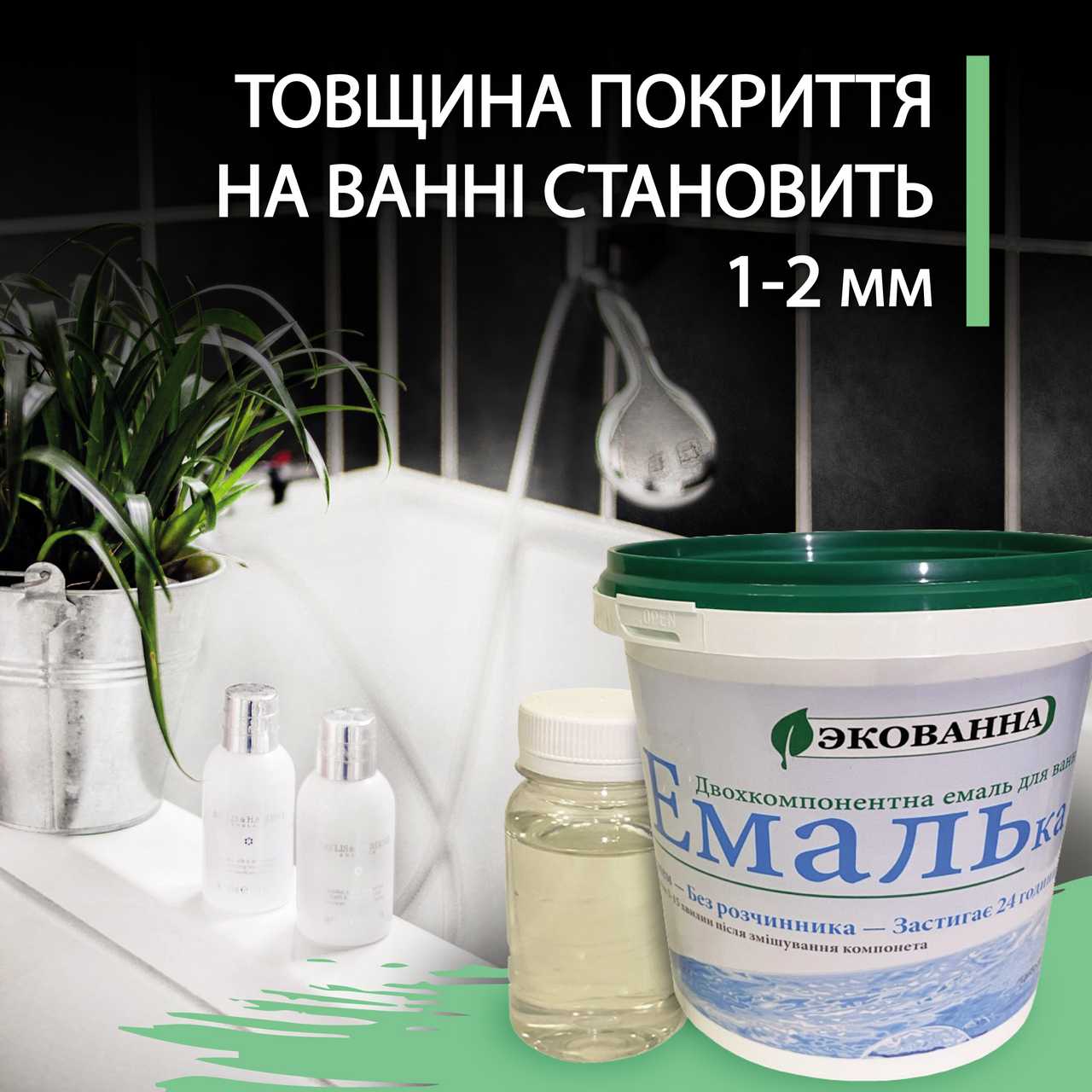 Емаль акрилова ЕкоЕмалька застосовується для фарбування сталевих, чавунних і акрилових ванн довжиною від 1,5 м до 1,7 м. Товщина фарбування в один шар.