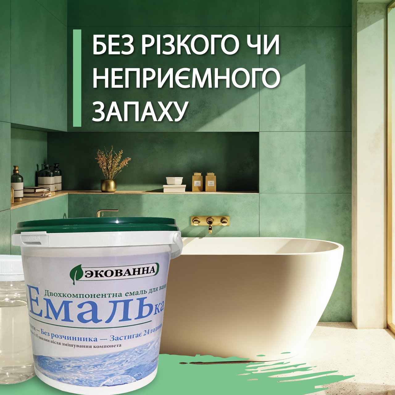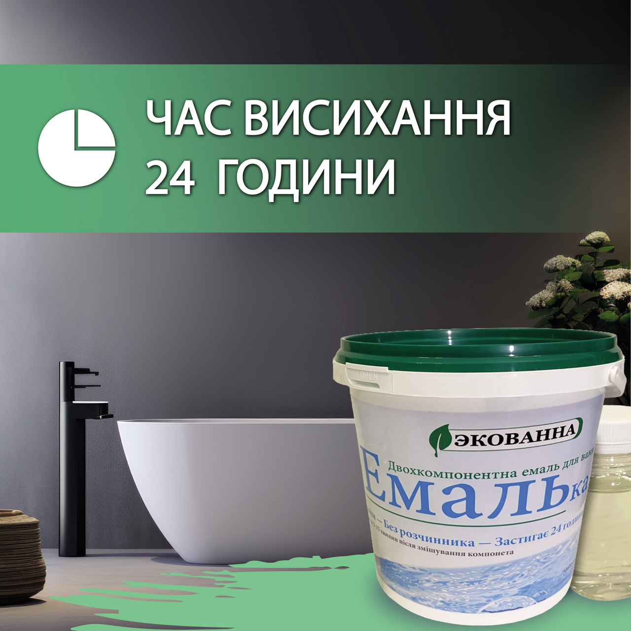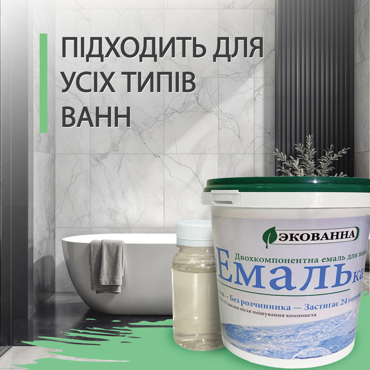 Емаль акрилова ЕкоЕмалька застосовується для фарбування сталевих, чавунних і акрилових ванн довжиною від 1,5 м до 1,7 м. Товщина фарбування в один шар.