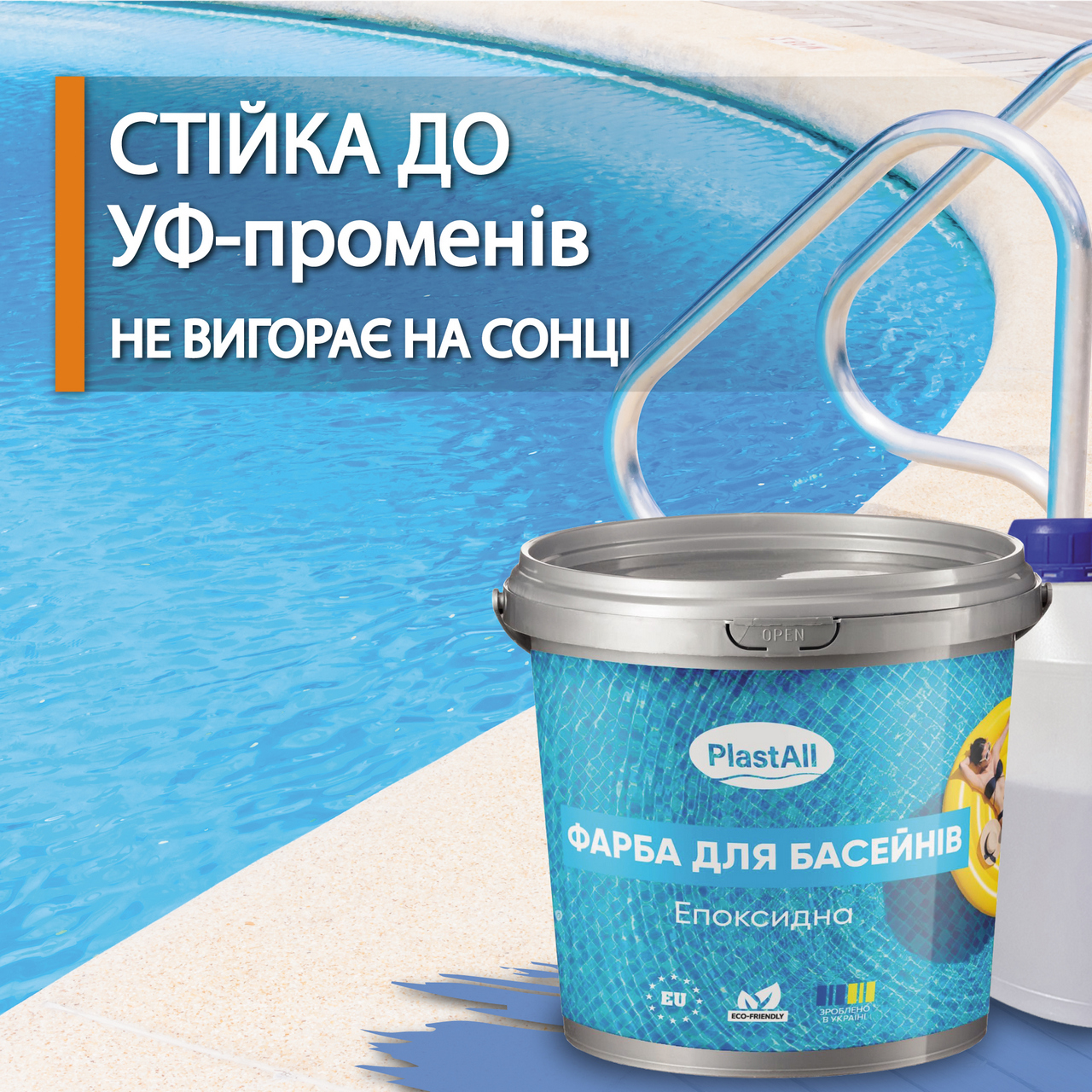 Найкращим рішенням є епоксидна фарба для басейну, оскільки вона створює водонепроникне, хімічно стійке покриття, не боїться хлору, постійного контакту з водою та механічних навантажень. Епоксидна фарба Plastall спеціально розроблена для басейнів із бетону та металу.