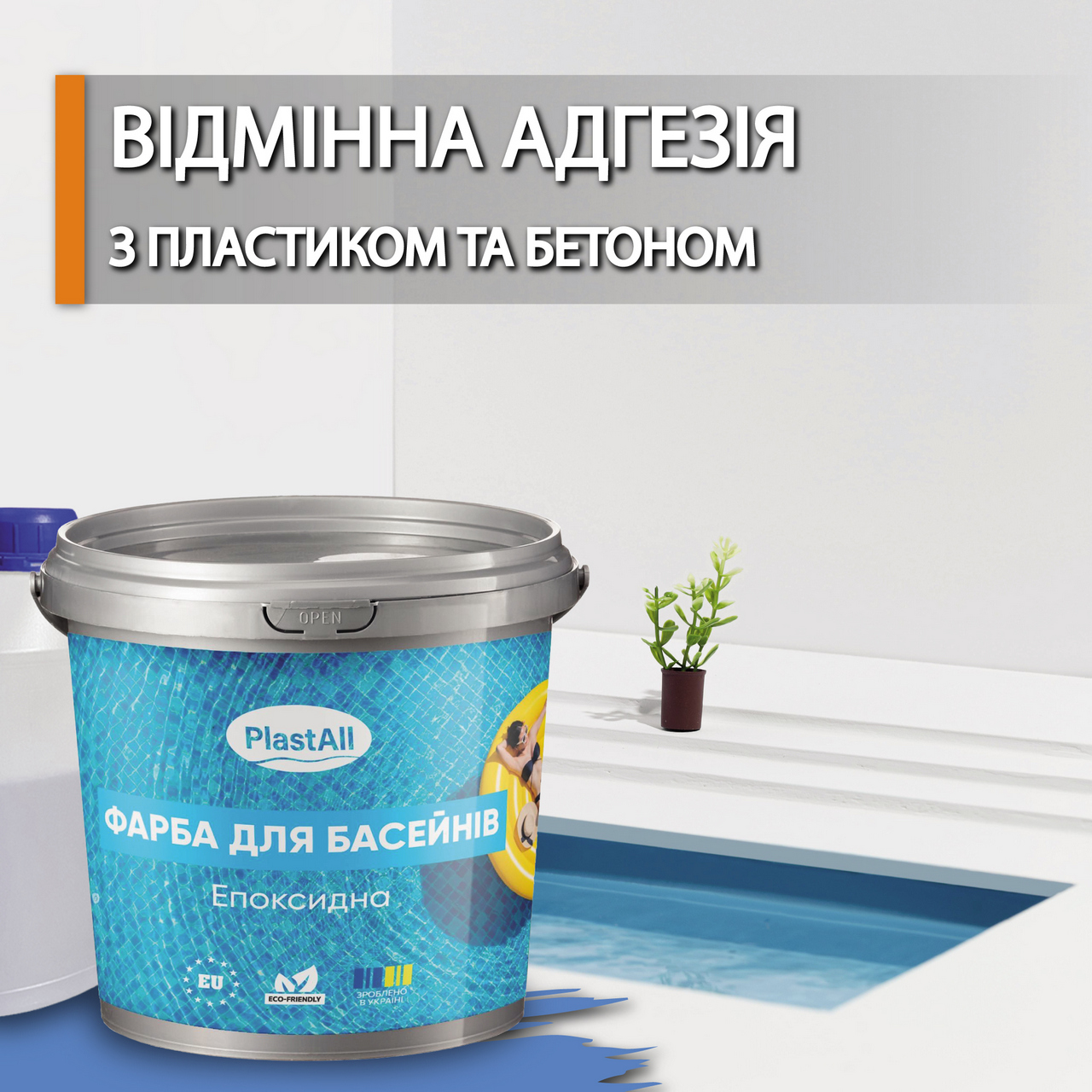 Найкращим рішенням є епоксидна фарба для басейну, оскільки вона створює водонепроникне, хімічно стійке покриття, не боїться хлору, постійного контакту з водою та механічних навантажень. Епоксидна фарба Plastall спеціально розроблена для басейнів із бетону та металу.