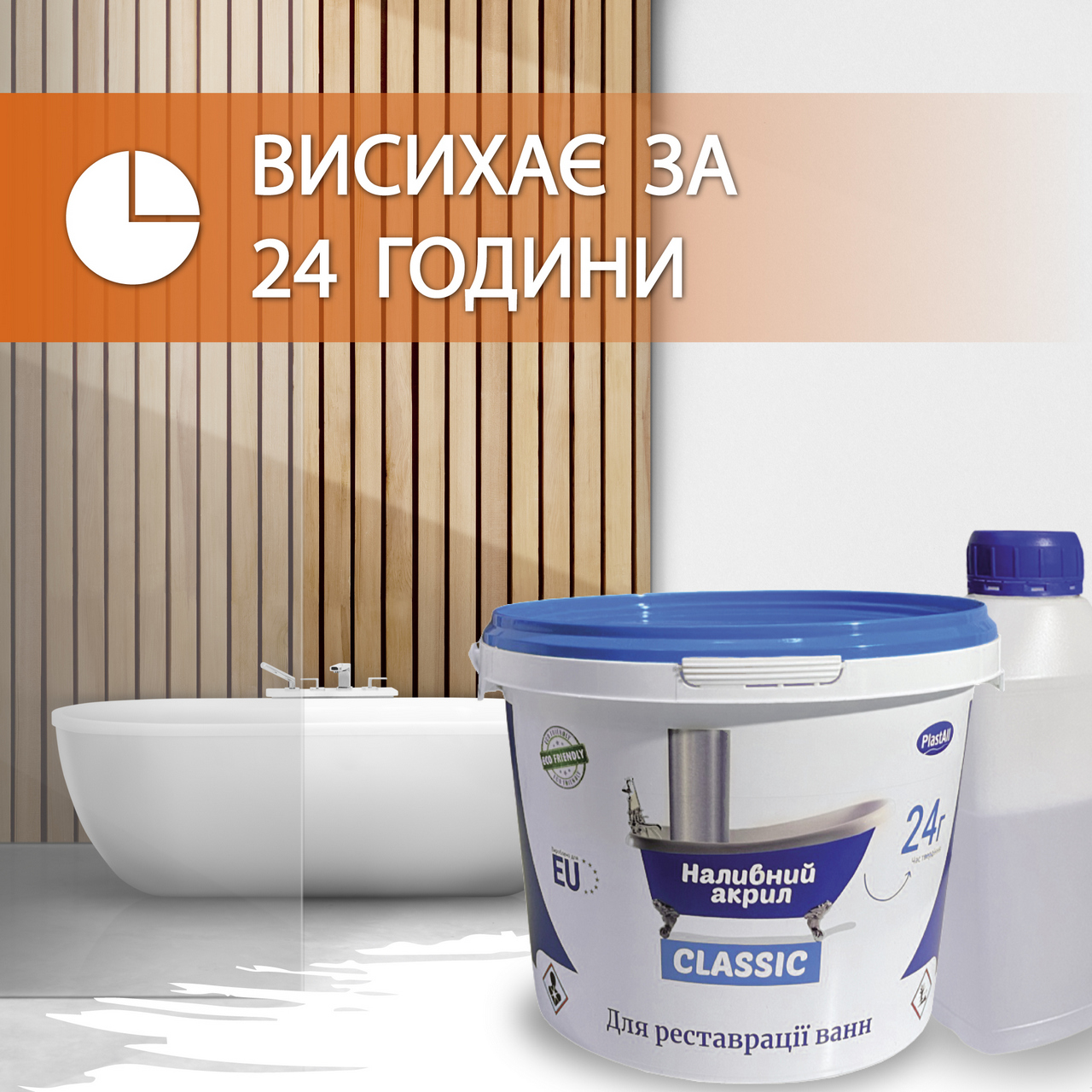 Комплект Plastall™ Classic вагою 2,45 кг розрахований спеціально для повного покриття ванни довжиною 120 см. Жодних залишків чи нестачі — тільки зручність та результат з першого разу.