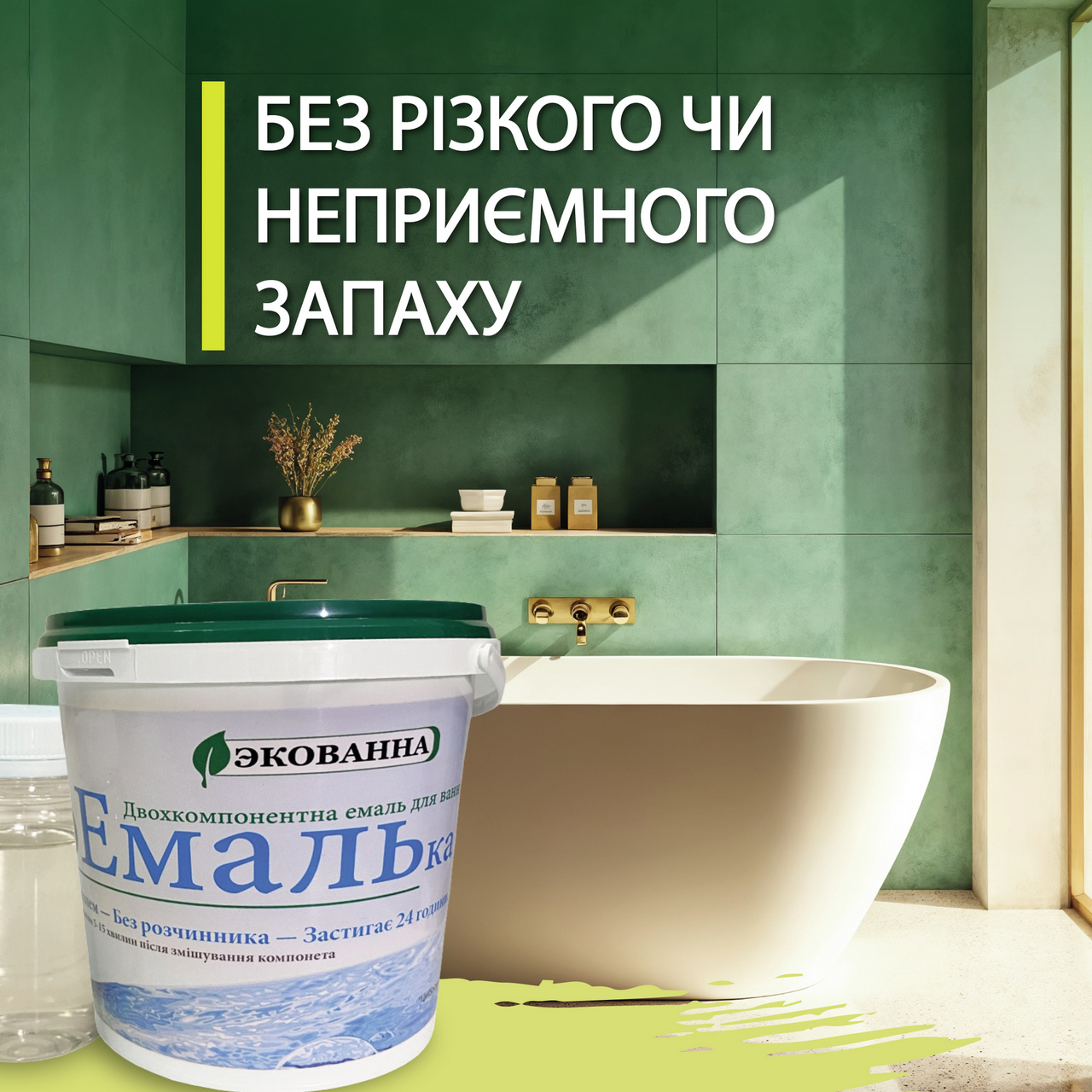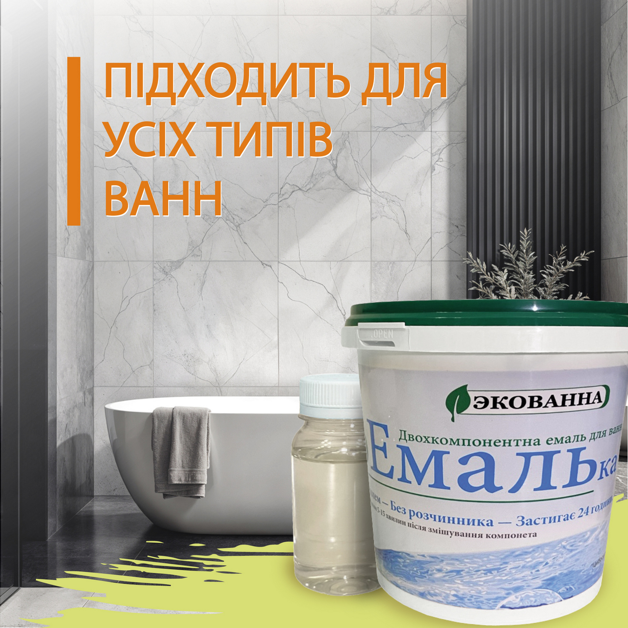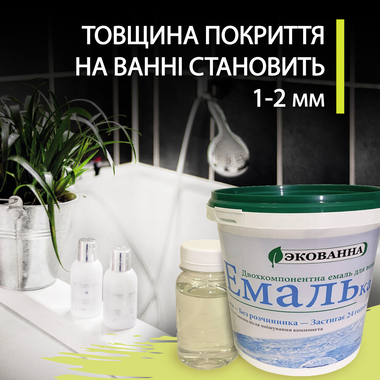 Емаль акрилова ЕкоЕмалька застосовується для фарбування сталевих, чавунних і акрилових ванн довжиною від 1,5 м до 1,7 м. Товщина фарбування в один шар.