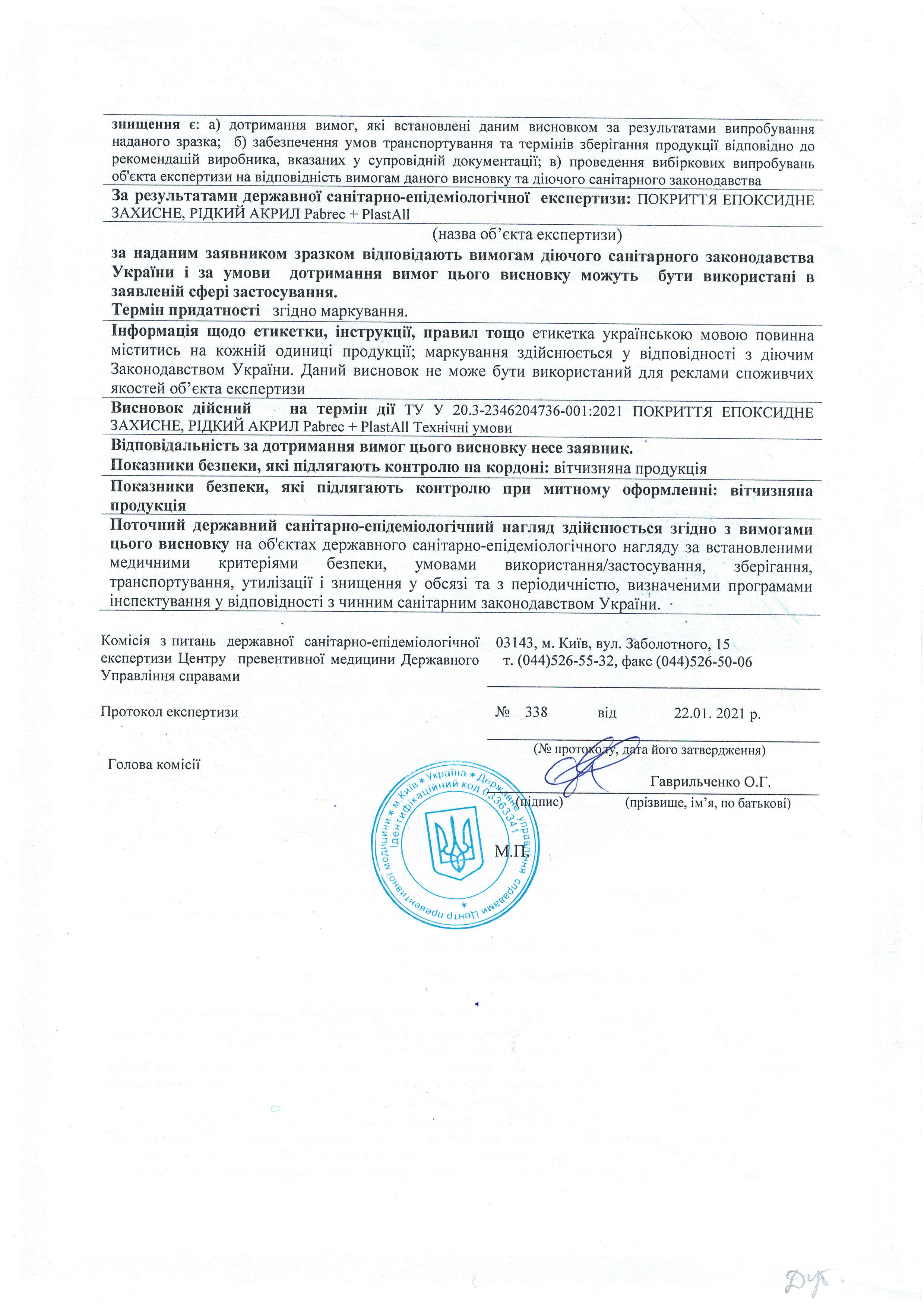 - Сертифікат відповідності — продукція відповідає технічним умовам ТУ У 20.3-2346204736-001:2021.