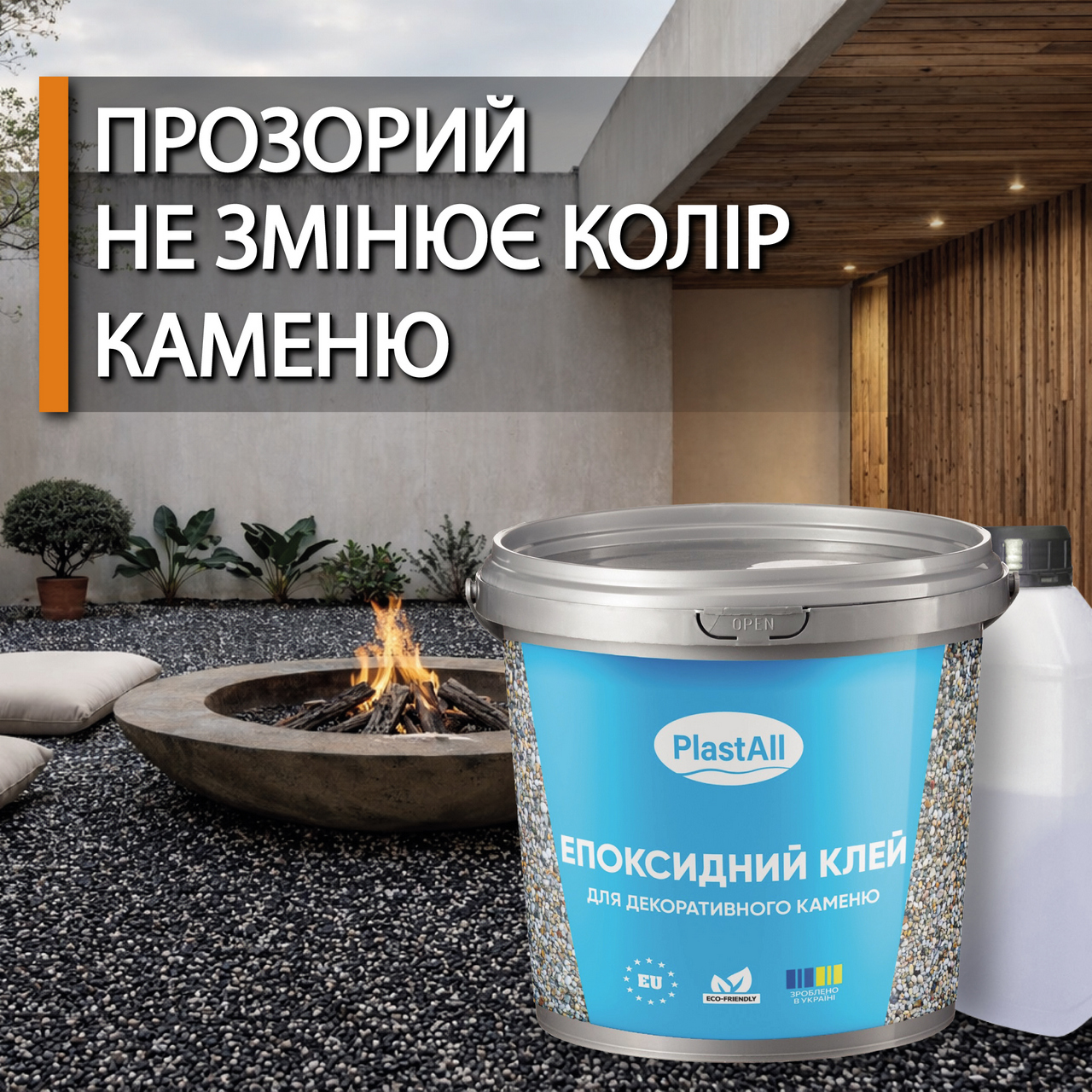Прозора основа клею не змінює колір кам'яної крихти — це важливо для збереження природної текстури та естетики декоративного покриття.