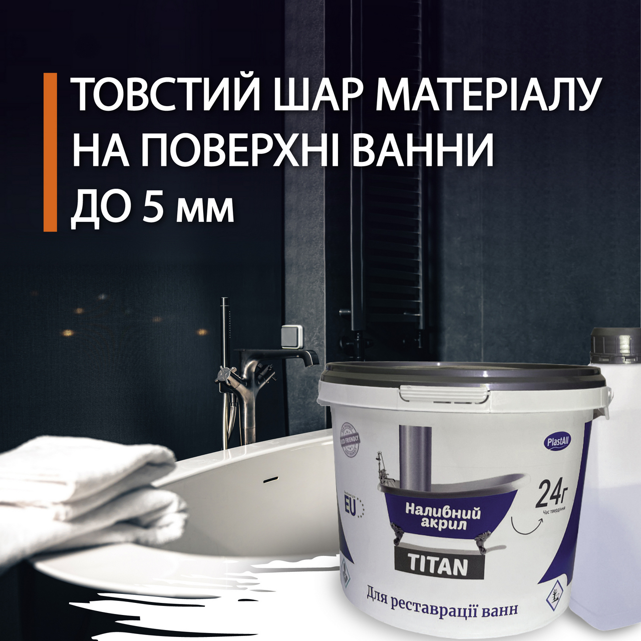 Plastall Titan — це двокомпонентний наливний акрил на основі епоксидних смол, розроблений для професійної реставрації ванн, душових піддонів та умивальників. Завдяки своїй формулі, матеріал забезпечує ідеальне розтікання, утворюючи гладке, глянцеве покриття без потьоків та бульбашок.