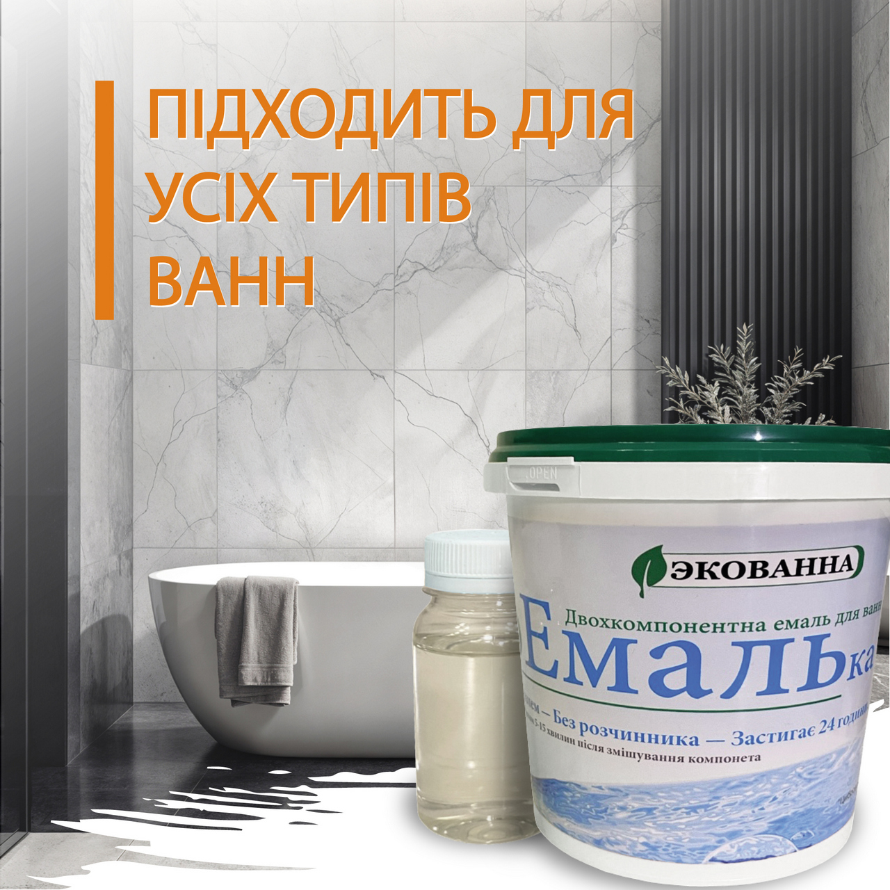 Емаль акрилова ЕкоЕмалька застосовується для фарбування сталевих, чавунних і акрилових ванн довжиною від 1,5 м до 1,7 м. Товщина фарбування в один шар.